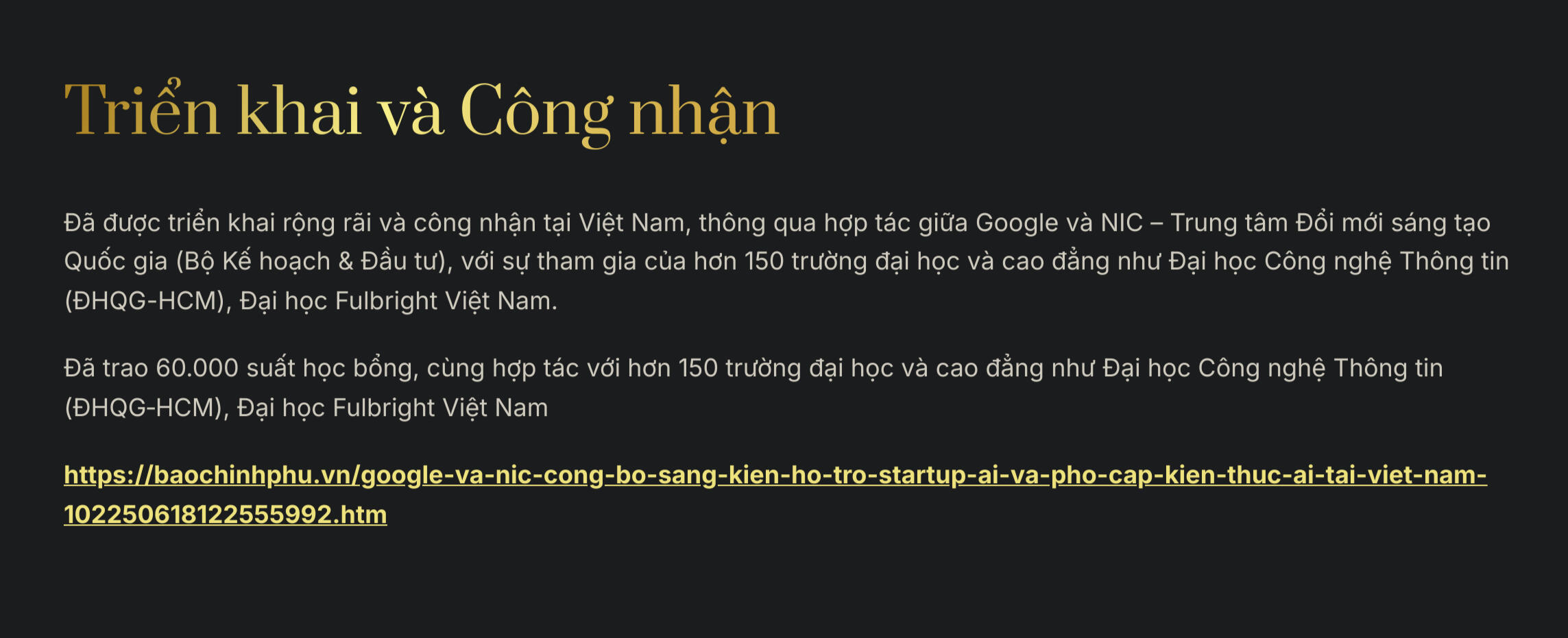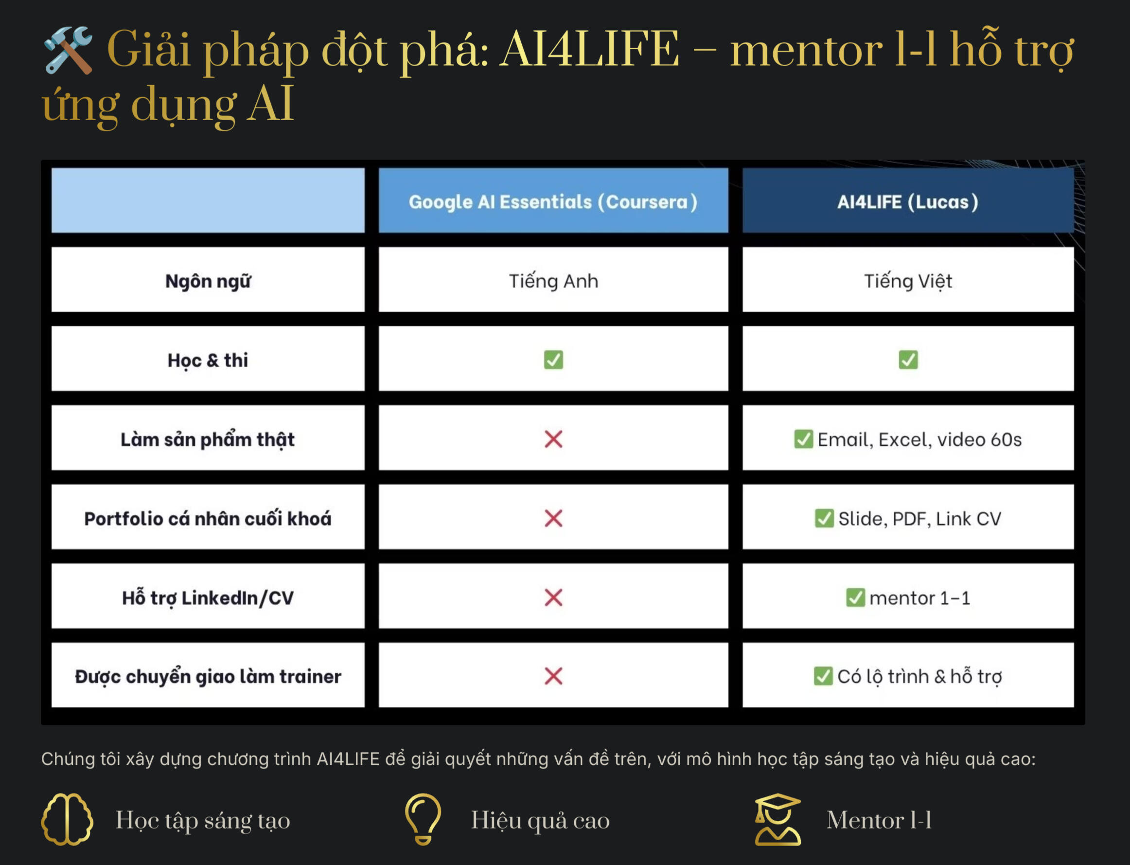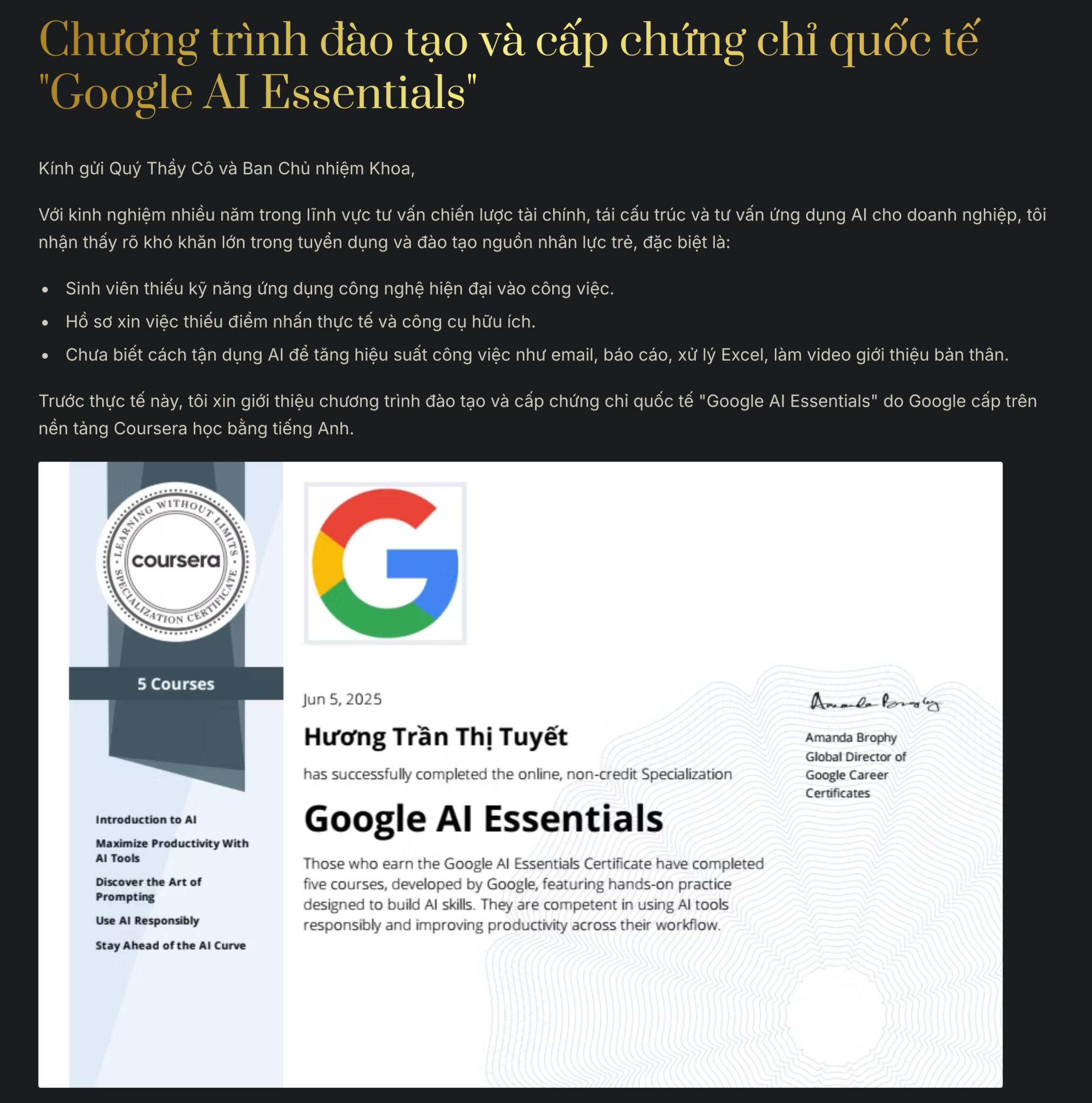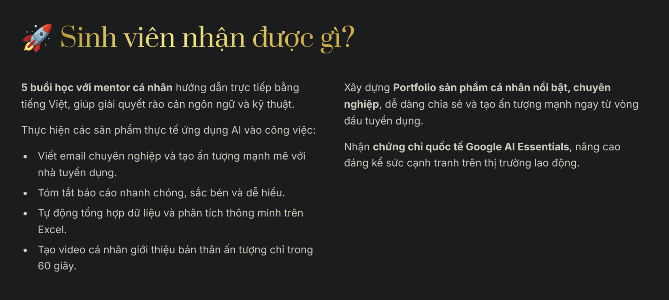 - Giúp hàng trăm học viên thi đậu Google AI Essentials & hoàn thiện portfolio
